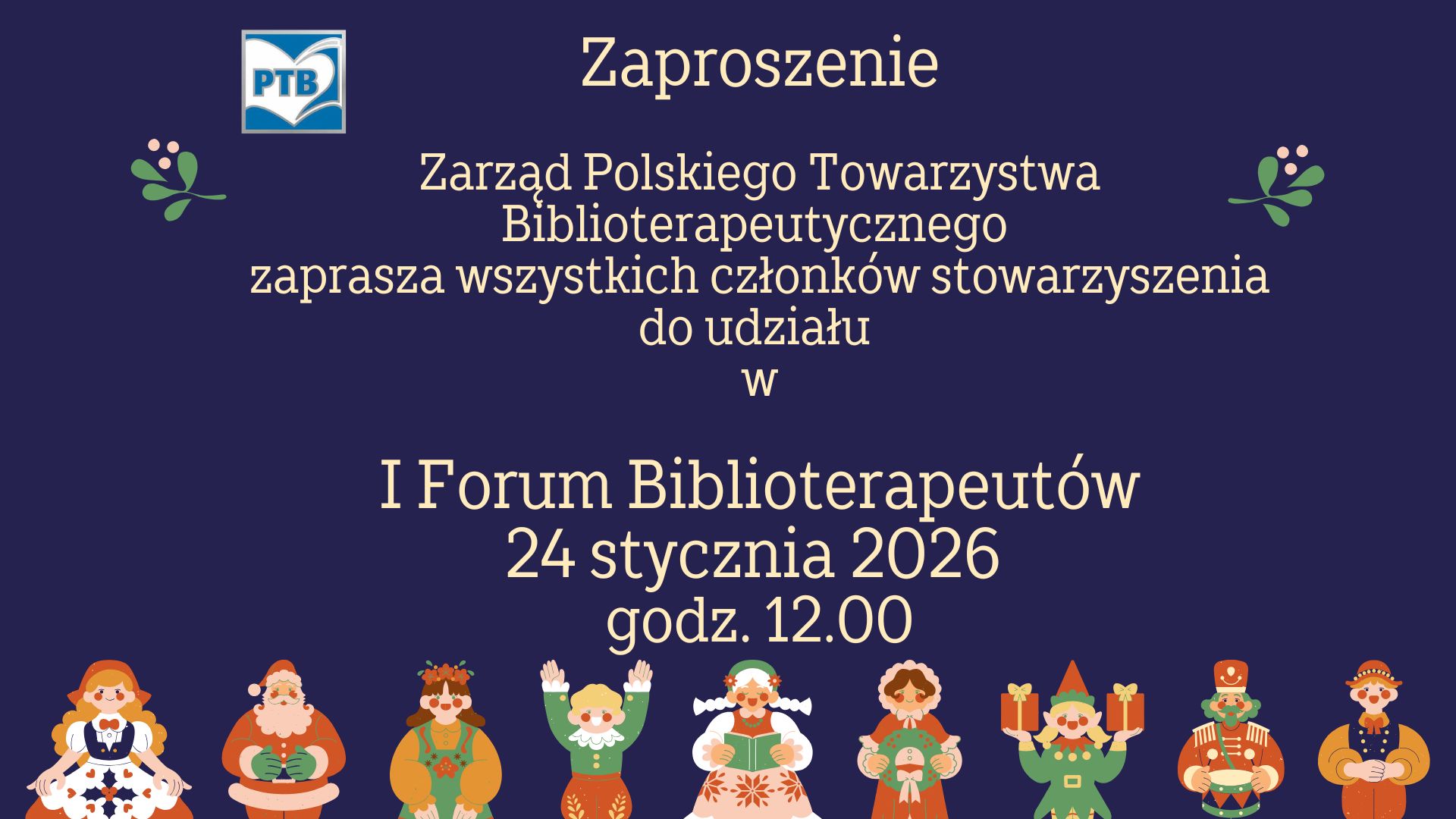 Zarząd Polskiego Towarzystwa Biblioterapeutycznego zaprasza wszystkich członków stowarzyszenia na pierwsze Forum Biblioterapeutów, które odbędzie się 24 stycznia 2026 (sobota) o godz. 12.00 na platformie Ms Teams. Hasłem przewodnim spotkania jest PoznajMY się! Dlatego głównym celem forum jest wymiana informacji o potencjale, kompetencjach osób zrzeszonych w stowarzyszeniu, poznanie ich działań biblioterapeutycznych, integracja środowiska. Zakładamy, że organizowane Forum biblioterapeutów spełni również cele takie jak: