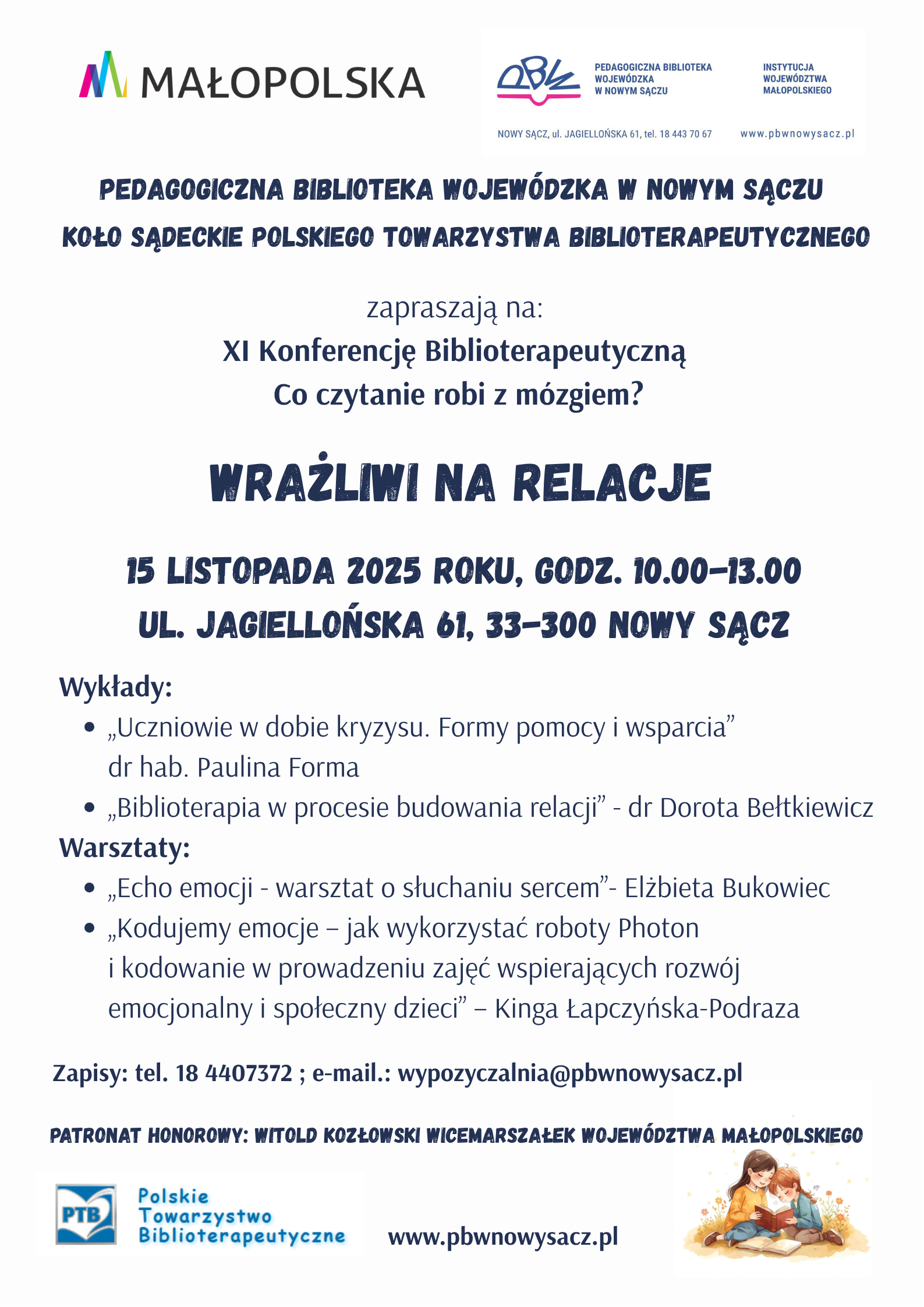 XI Konferencja Biblioterapeutyczna „Co czytanie robi z mózgiem? Wrażliwi na relacje” Zapraszamy do udziału w XI Konferencji Biblioterapeutycznej, która odbędzie się 15 listopada 2025 roku o godz. 10.00 w Nowym Sączu, ul. Jagiellońska 61
