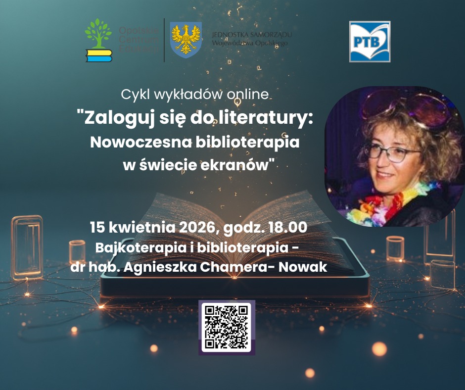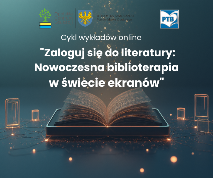 Opolskie Centrum Edukacji Pedagogiczna Biblioteka Wojewódzka w Opolu oraz Polskie Towarzystwo Biblioterapeutyczne (Koło w Opolu) serdecznie zapraszają na wyjątkowy cykl spotkań online poświęcony roli literatury w dobie cyfryzacji.Spotykamy się przed ekranami – tym razem w słusznej sprawie!