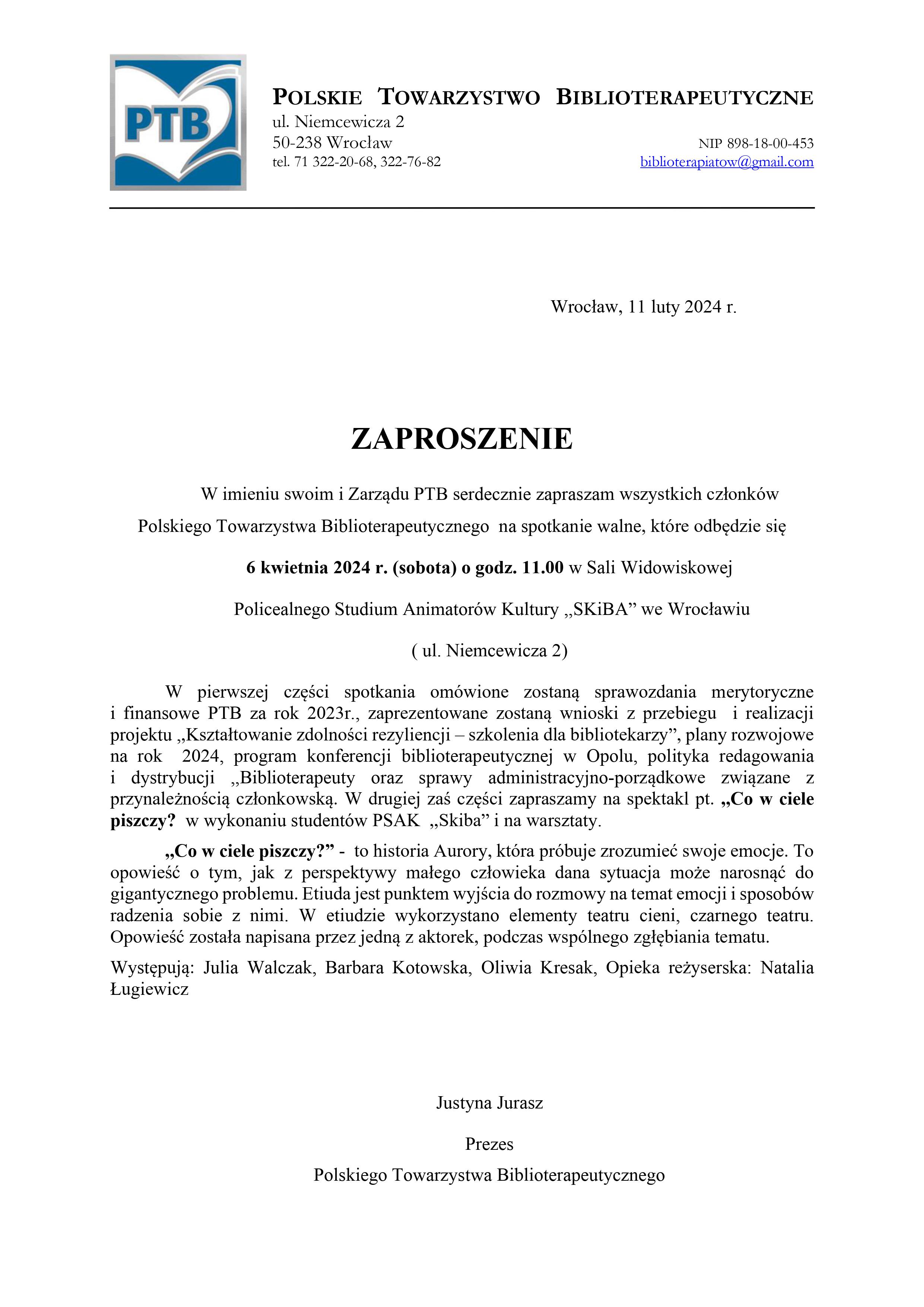 W dniu 6 kwietnia 2024 r. odbyło się zebranie walne członków PTB w Policealnym Studium Animatorów Kultury Skiba we Wrocławiu. Spotkanie prowadziła prezes Zarządu PTB Justyna Jurasz i wiceprezes - Ewa Kramarczyk, protokół sporządzała - sekretarz Zarządu PTB - Paulina Knapik- Lizak. Podczas spotkania zaakceptowano dwa sprawozdania: finansowe i merytoryczne za rok ubiegły. Omówione zostały najważniejsze działania promujące biblioterapię, które miały miejsce w różnych placówkach w Polsce w 2023, O sukcesach rozwojowych stowarzyszenia i o założeniach planu rozwojowego na ten rok i najbliższe lata wizjonersko, konkretnie i rzeczowo przedstawiała Pani prezes Justyna Jurasz. Następnie Pani wiceprezes Ewa Kramarczyk zaprezentowała cele, przebieg i wnioski ze zrealizowanego projektu ,,Kształtowanie zdolności rezyliencji - szkolenia dla bibliotekarzy" dofinansowanego ze środków Ministerstwa Kultury i Dziedzictwa Narodowego pochodzących z Funduszu Promocji Kultury. W kolejnych punktach spotkania omówiono pracę zespołu ds. szkoleń i kursów (Ewelina Surniak), politykę dystrybucji ,,Biblioterapeuty"( Paulina Knapik-Lizak), organizację wrześniowej konferencji w Opolu (Justyna Jurasz) i koncepcję informacyjno-promocyjną nowej strony www PTB ( Paweł Jurasz).