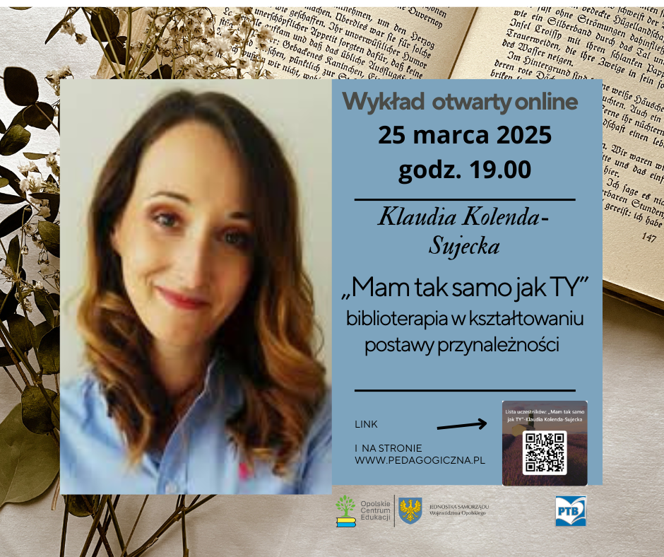 25 marca o godz., 19.00 zapraszamy na kolejny wykład w ramach projektu ,,Biblioterapia w edukacji i wychowaniu ” realizowany w ramach współpracy Polskiego Towarzystwa Biblioterapeutycznego i Opolskiego Centrum Edukacji Pedagogiczna Biblioteka Wojewódzka w Opolu dotyczący wykorzystania biblioterapii w kształtowaniu postawy przynależności ,,Mam tak samo jak TY” . Wykład wygłosi Klaudia Kolenda- Sujecka – psycholog z Poradni Psychologicznej w Szczecinie.