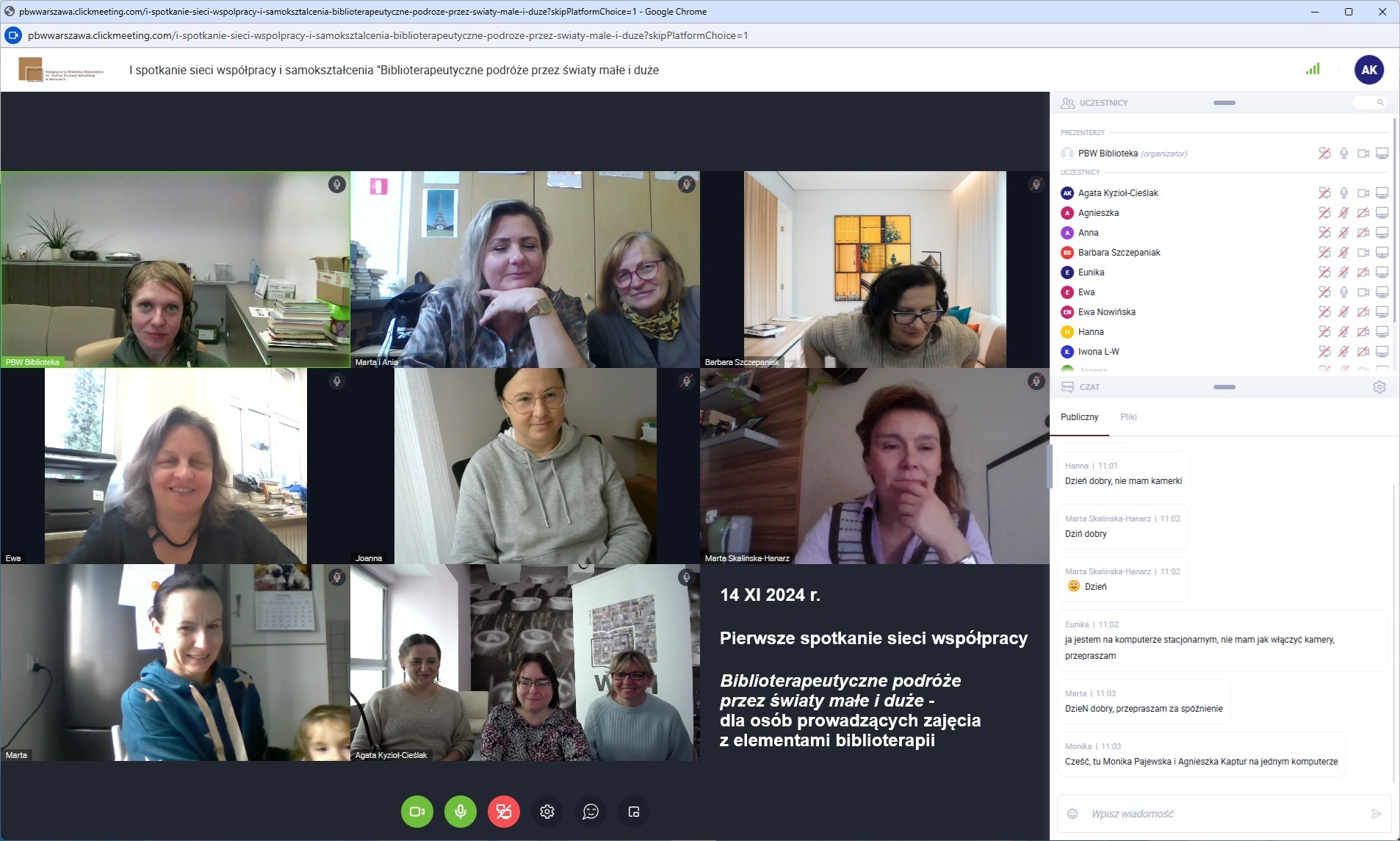 14 XI, w dniu rozpoczynającym III Ogólnopolski Tydzień Biblioterapii, trwający do 21 XI włącznie, odbyło się pierwsze spotkanie sieci współpracy Biblioterapeutyczne podróże przez światy małe i duże, w którym uczestniczyło 19 osób. Wszyscy uczestnicy są także członkami naszego Warszawskiego Koła PTB. Na spotkaniu przekazaliśmy informacje o zasadach działania sieci, a także zaplanowaliśmy terminy i tematykę kolejnych spotkań. Sieć będzie spotykała się trzy razy w roku, każdemu spotkaniu będzie towarzyszyło szkolenielub spotkanie z ciekawymi osobami z kręgów powiązanych z biblioterapią. Spotkania będą okazją do dzielenia się dobrymi praktykami, materiałami oraz wiedzą pomiędzy uczestnikami. Powstało miejsce na dysku Google naszego Koła, gdzie zamieszczamy materiały dostępne tylko dla członków Koła i sieci, dostępne są szkolenia na platformie Moodle Pedagogicznej Biblioteki im. KEN w Warszawie, a także zapraszamy osoby z sieci do korzystania z wszelkich dostępnych form szkoleniowych z elementami biblioterapii, jakie biblioteka oferuje.