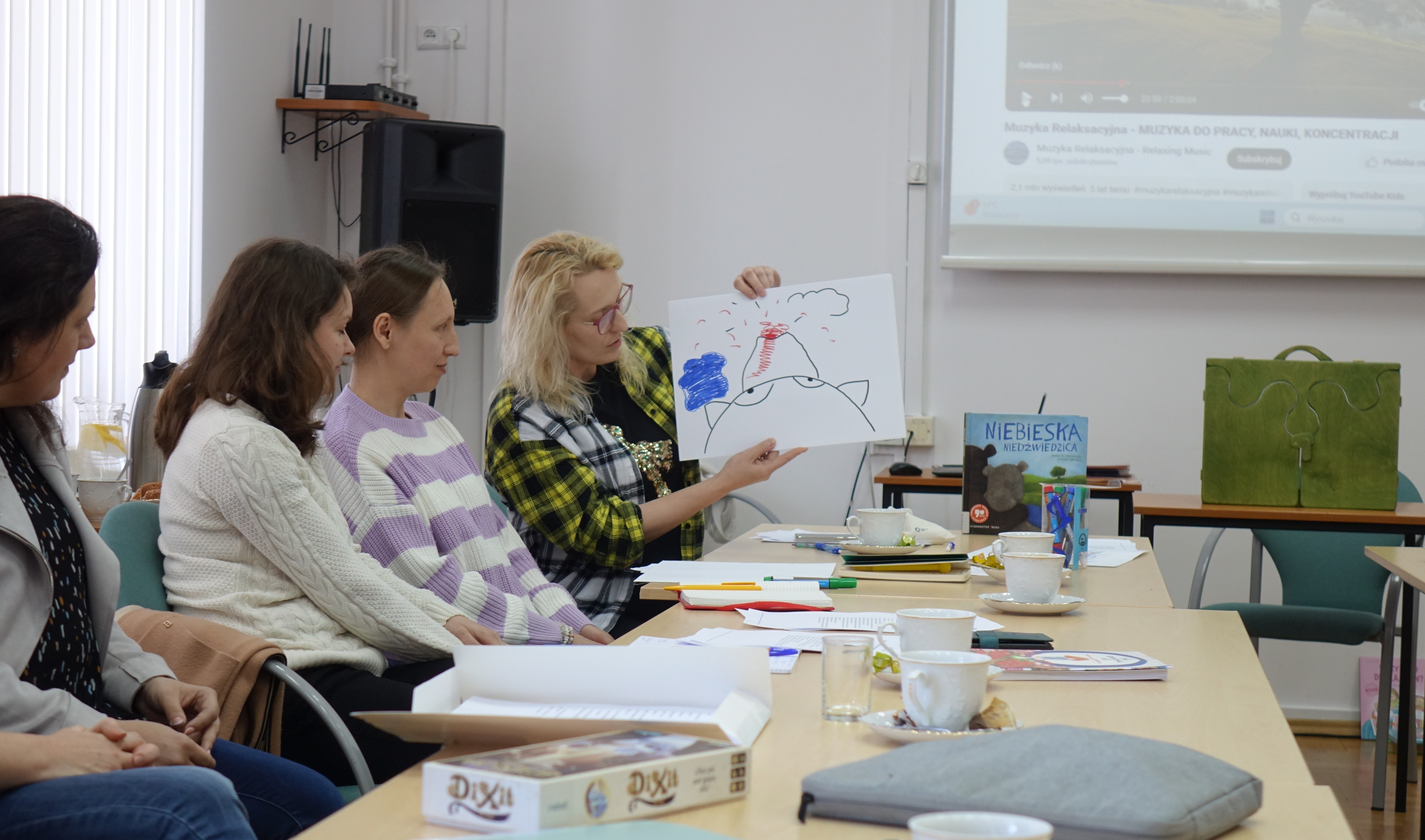 W trakcie warsztatów korzystaliśmy z kart DiXit, kart antystresowych, tworzyliśmy kolaże słowne. Wzmacnialiśmy przekaz, że słowa mają niesamowitą siłę poprzez liczne formy pracy inspirujące do działań z różnymi grupami. Nasze spotkanie zakończyliśmy stworzeniem bajki o charakterze terapeutycznym, projektując ilustracje do teatrzyku kamishibai.