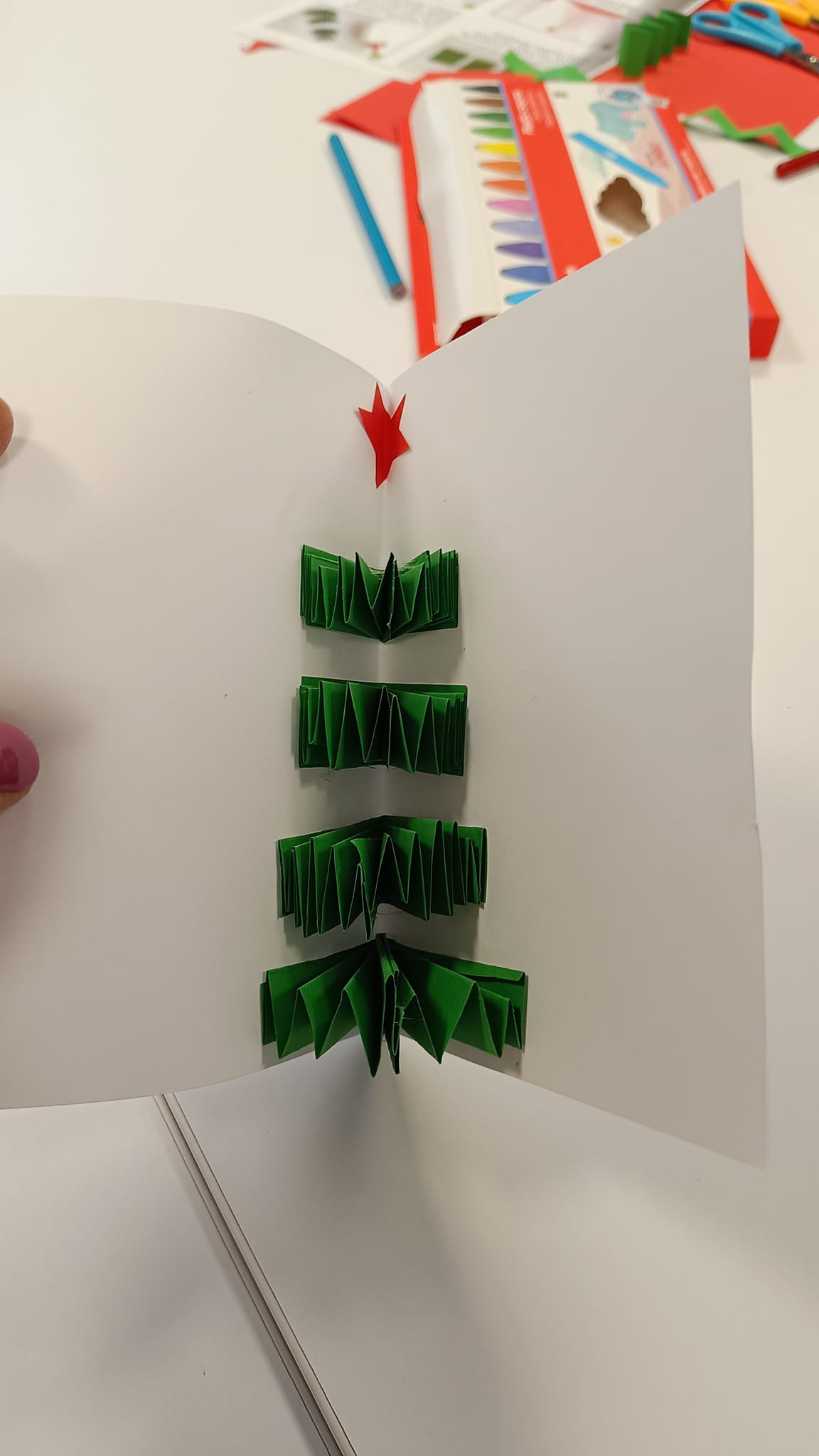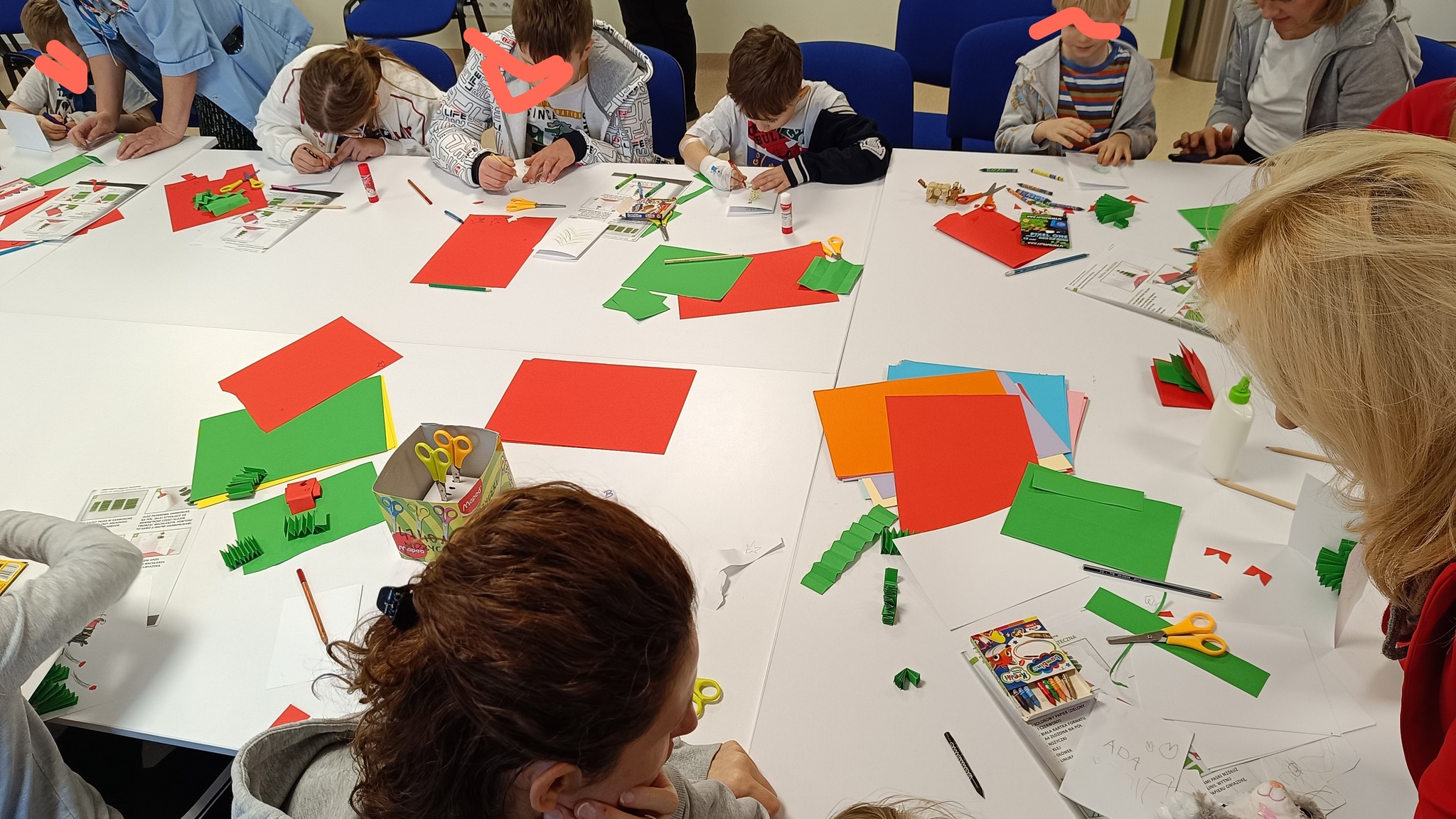 Po lekturze i inspirujących rozmowach przyszedł czas na działania. Dzieciaki z pomocą nauczycielek, pielęgniarek oraz rodziców zajęły się tworzeniem kartek świątecznych. Projekt kartki pokazała Basia. Pacjenci ochoczo wycinali choinki i tworzyli świąteczne motywy na swoich pracach.