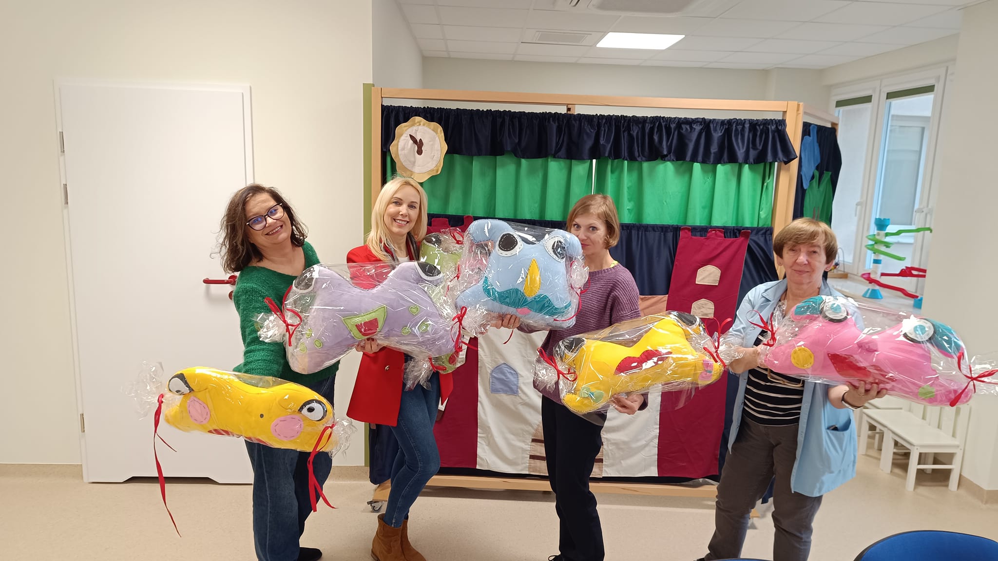 Koleżankom z WK PTB towarzyszyła Ewa Kirsz, która w listopadzie przeprowadziła w Pedagogicznej Bibliotece Wojewódzkiej warsztaty w ramach projektu Emotkowe Pożeracze Smutków „Igłą i Uśmiechem”. Na szkoleniu uczestnicy i uczestniczki szyli pluszowe maskotki w kształcie poduszek, które znajdują się na pierwszym zdjęciu. Na koniec zajęć w szpitalu te maskotki zostały wręczone wszystkim dzieciom uczestniczącym w spotkaniu.