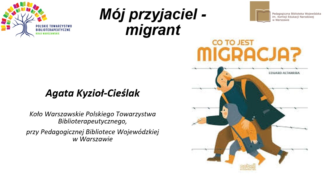 13 grudnia br., w rocznicę powołania Warszawskiego Koła PTB, zaprezentowałam autorskie szkolenie Mój przyjaciel migrant, będące jednocześnie materiałem metodycznym do przeprowadzenia zajęć z elementami biblioterapii o migracji i migrantach dla młodzieży od 6-7 klasy szkoły podstawowej wzwyż. Materiały nadadzą się także do zajęć z dorosłymi.