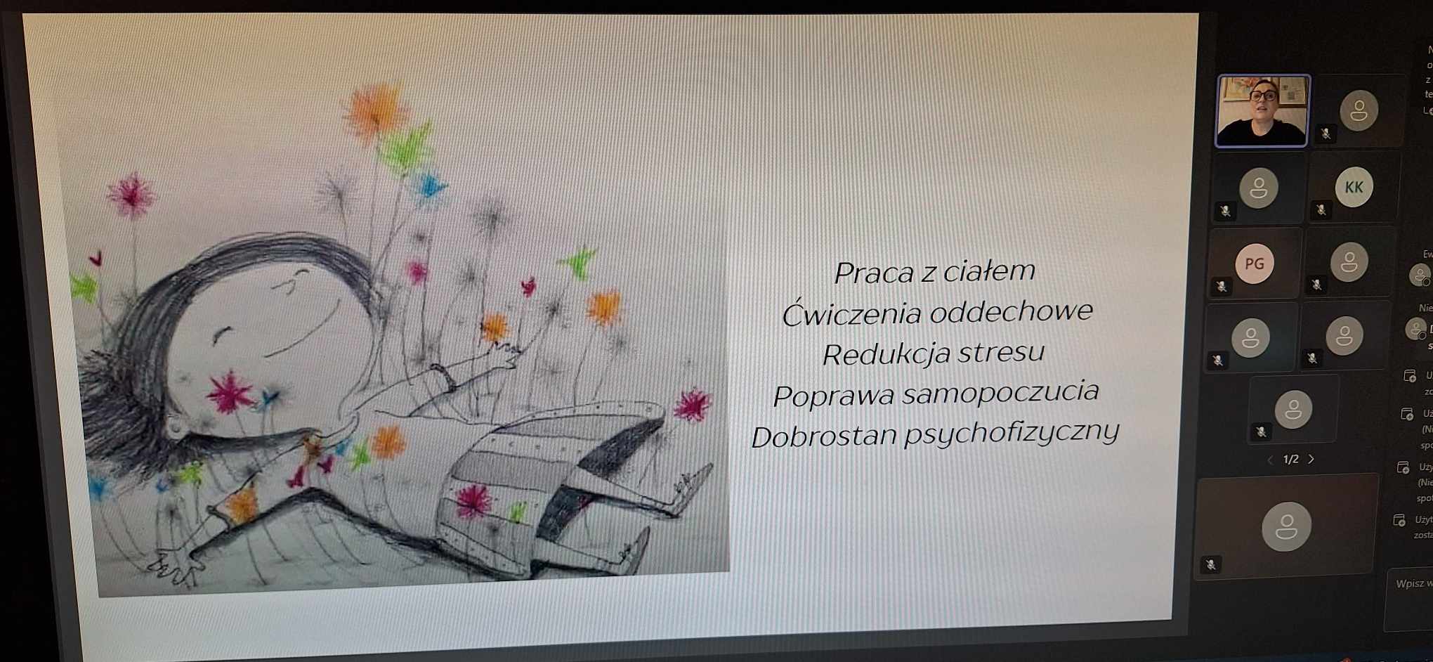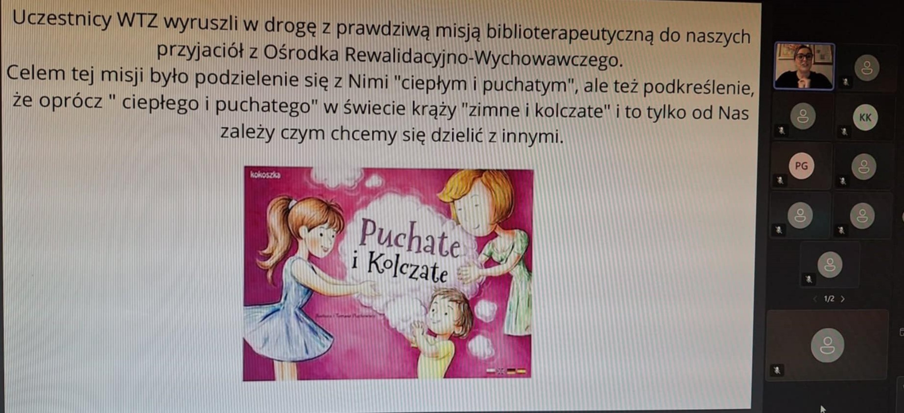 Zaprezentowała główne cele prowadzonych warsztatów biblioterapeutycznych (m.in. odkrywanie, wzmacnianie i rozwijanie potencjału oraz mocnych stron każdego uczestnika zajęć, praca nad poprawą komunikacji, poprawa nastroju, dobrostanu, redukcja stresu, wzmacnianie poczucia wartości, poczucia sprawstwa, aktywizacja do działania, budowanie umiejętności współpracy w grupie oraz integracja grupy), zwróciła uwagę na istotę dostosowania form i metod pracy do indywidualnych potrzeb uczestników zajęć oraz łączenia różnych metod pracy (praca z tekstem, dyskusja, burza mózgów, prace plastyczne, elementy dramy, ćwiczenia oddechowe i elementy choreoterapii, teatrzyk kamishibai). Webinar był bardzo ciekawy, bogaty w treści merytoryczne oraz materiał ilustracyjny w postaci licznych fotografii z przeprowadzonych warsztatów, ze wskazaniem konkretnych tytułów książek oraz przykładów ich zastosowania. Prelegentka z ogromną pasją i zaangażowaniem zaprezentowała metody pracy z osobami z niepełnosprawnością intelektualną, zwróciła uwagę na wrażliwość i wyczucie piękna oraz zaangażowanie w podejmowane działania uczestników warsztatów. Wskazała również jak ważna przy przygotowaniu i przeprowadzeniu warsztatów biblioterapeutycznych i innych jest współpraca całego zespołu terapeutów danej placówki. Bardzo dziękujemy naszej koleżance za podzielenie się swoim doświadczeniem oraz inspiracje do działania.