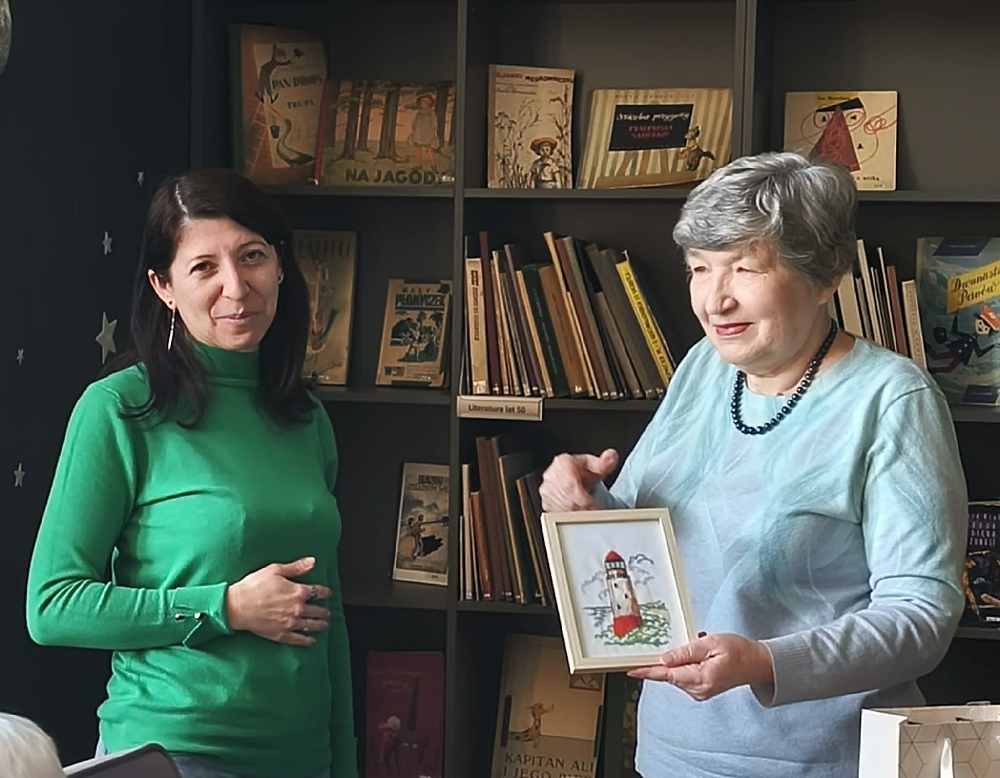 Przewodnicząca Koła, Magdalena Prokopowicz wręczyła drobny, ale symboliczny upominek Ewelinie Surniak, latarnię morską wyszytą haftem krzyżykowym dziękując za nieustające wsparcie merytoryczne udzielane członkiniom i członkom Koła Wrocławskiego PTB oraz szerokie dzielenie się swoim jakże bogatym doświadczeniem biblioterapeutycznym.