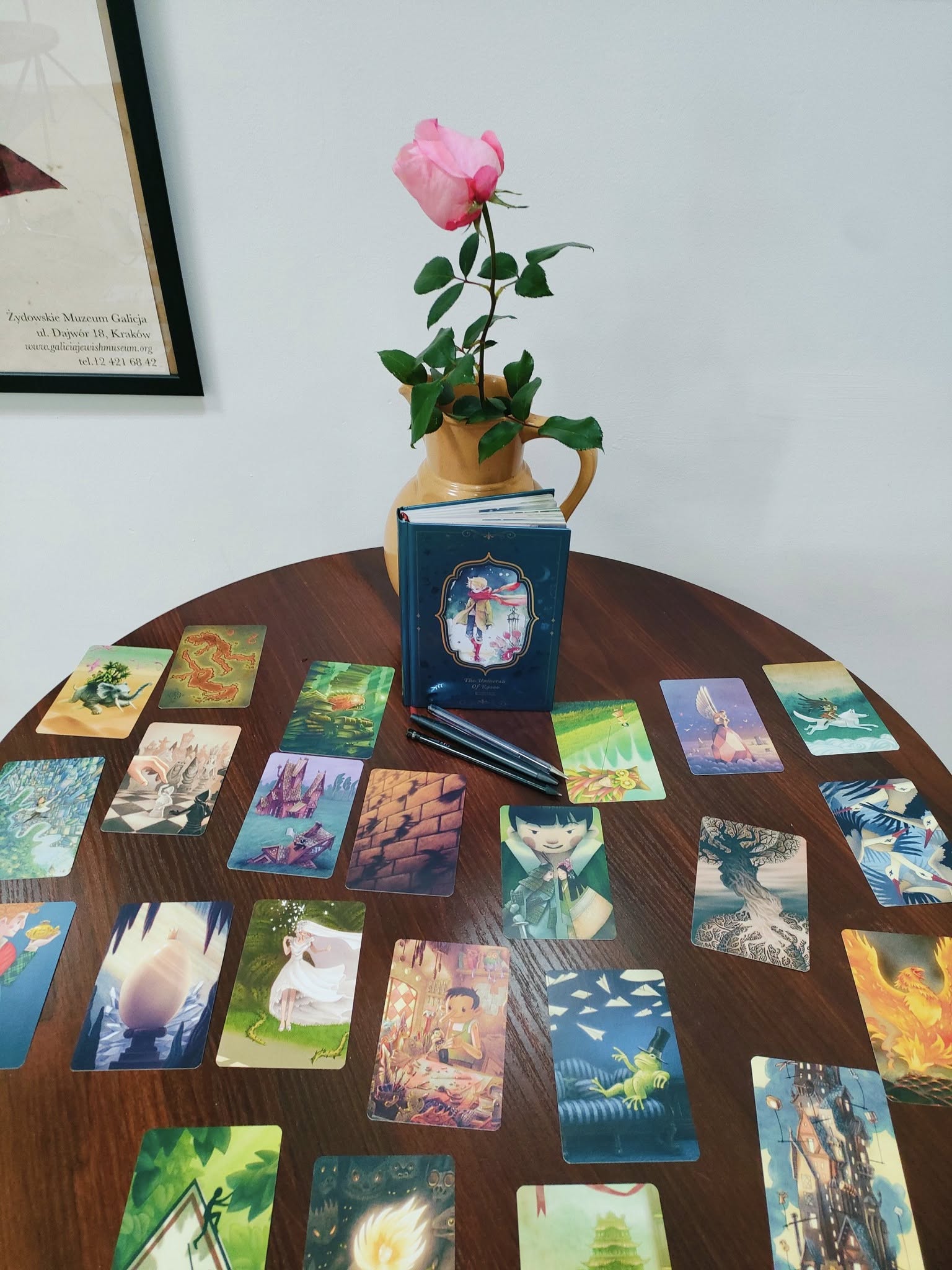 Szczególnie ważne były dla nas środki wizualne: ilustracje do baśni i zakładek, autorstwa Emilii Bober-Kiełt, samodzielnie zaprojektowane akwarelowe pocztówki czy fantastyczne karty ilustracyjne Dixit, dzięki którym trafniej zinterpretowaliśmy baśniową symbolikę i swoje przeżycia.